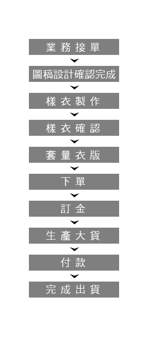 業務接單→客製圖稿設計確認完成→客製樣衣製作→客製樣衣確認→套量衣版→下單→訂金→生產大貨→付款→完成出貨